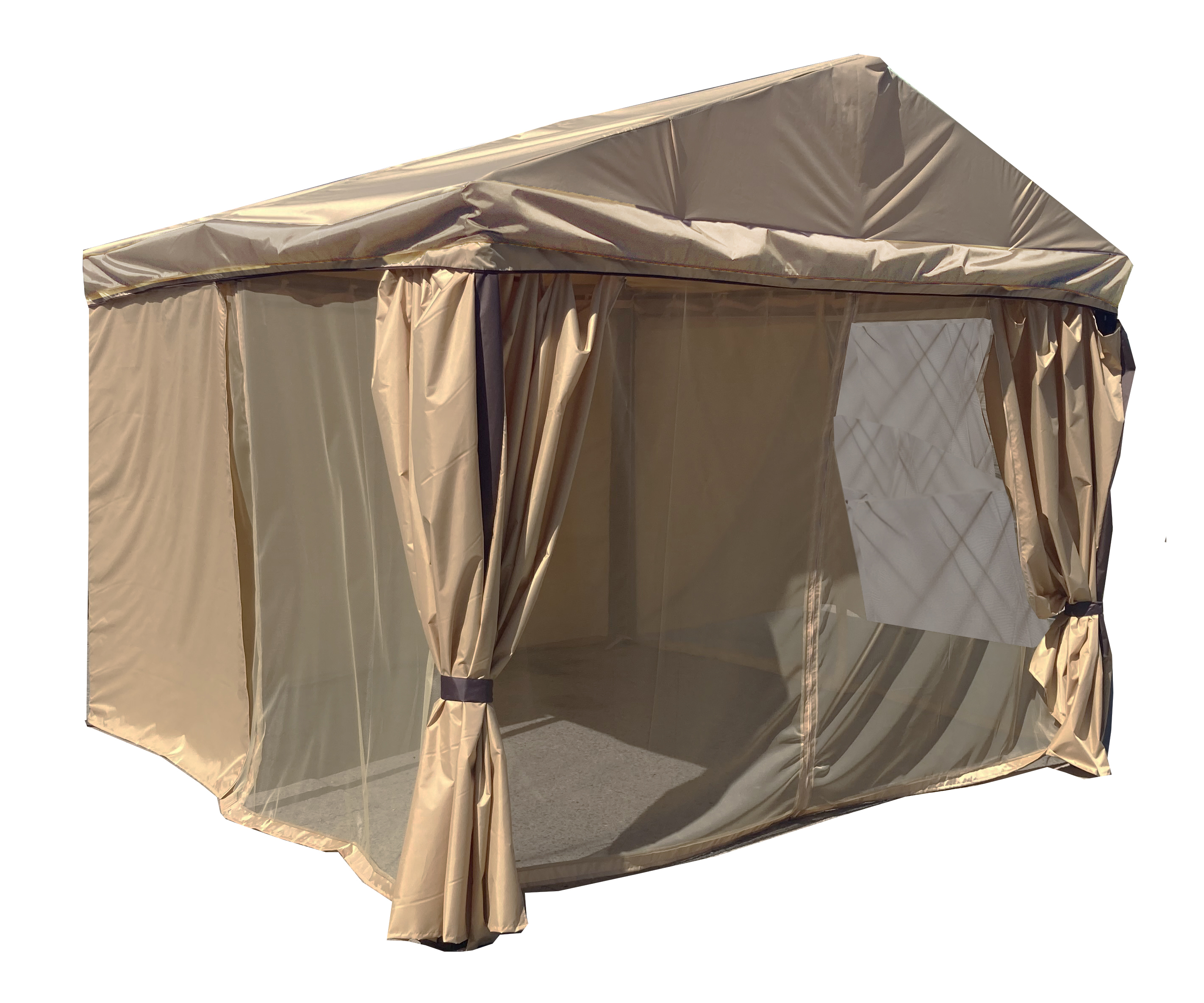 Дополнительно : высота по коньку 2,55м, высота стоек 2м, высота входного проема 1,85м. Крыша Oxford 420D. Защита от насекомых: пологи из специальной сетки, м/э . Все крепления металл на сварных соединениях, на ножках подножники с отверстиями с анкерами.