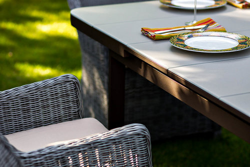 Дополнительно : Искусственный ротанг, круглое плетение 3,5 мм; столешница- закаленное стекло 5 мм, цвет стекла - молочный, цвет основания - темный шоколад, раздвижной механизм столешницы - 180/240 см